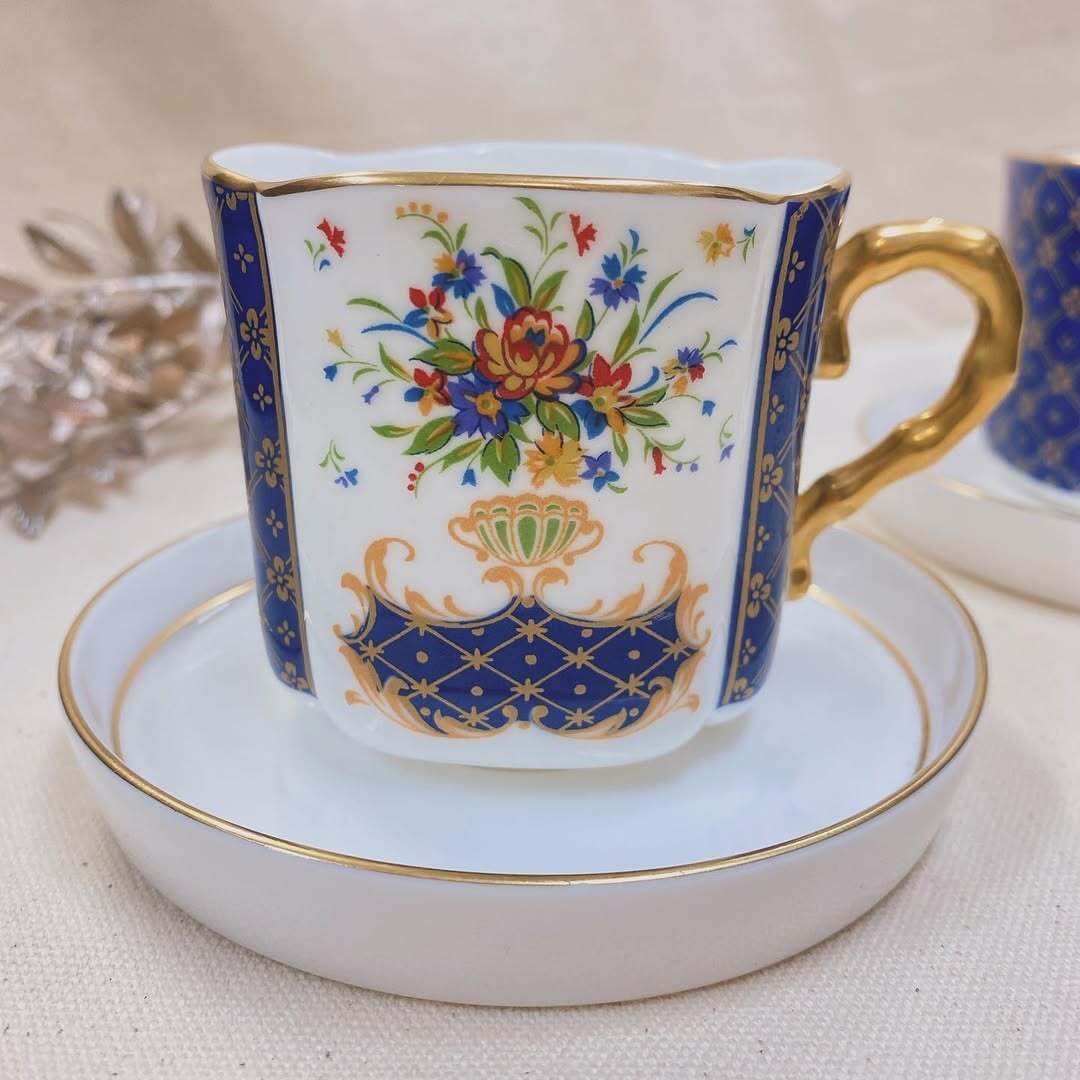 深みのあるロイヤルブルーを基調に、鮮やかな花柄と繊細なゴールド装飾が目を引くカップ