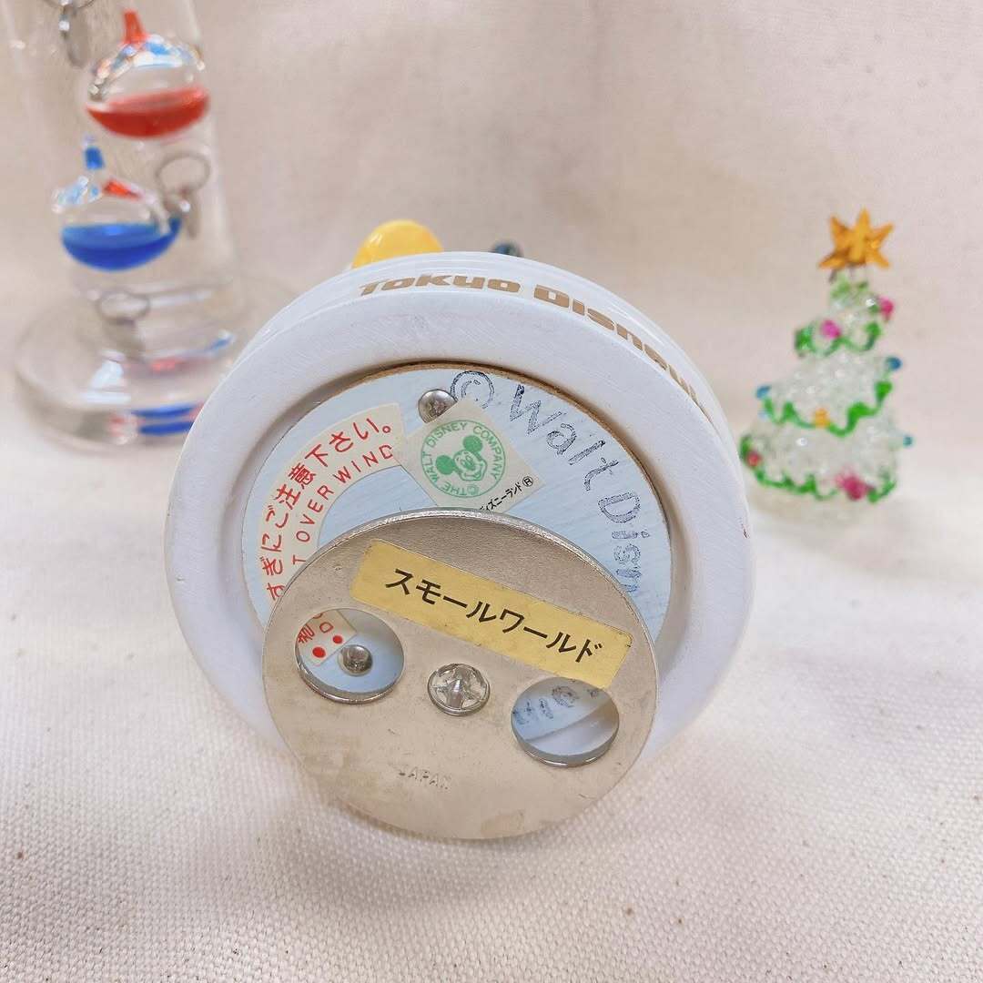 このオルゴールは、ネジを回すとあの有名な「イッツ・ア・スモールワールド」の音楽が優しく響き、ミニーちゃんがゆっくりその場で回転する仕掛け付き