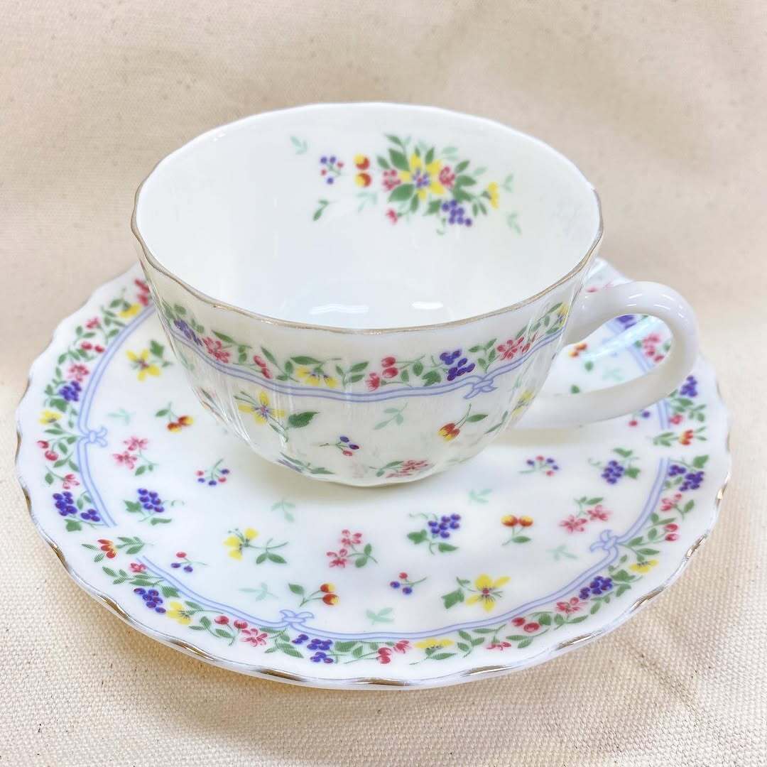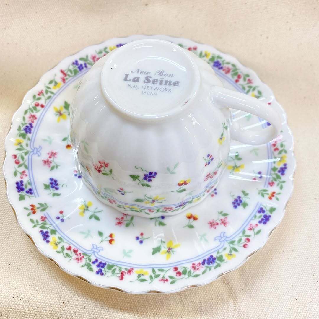 色とりどりの小花やフルーツのモチーフが散りばめられた、美しい「ラ・セーヌ」ブランドのティーカップ&ソーサー