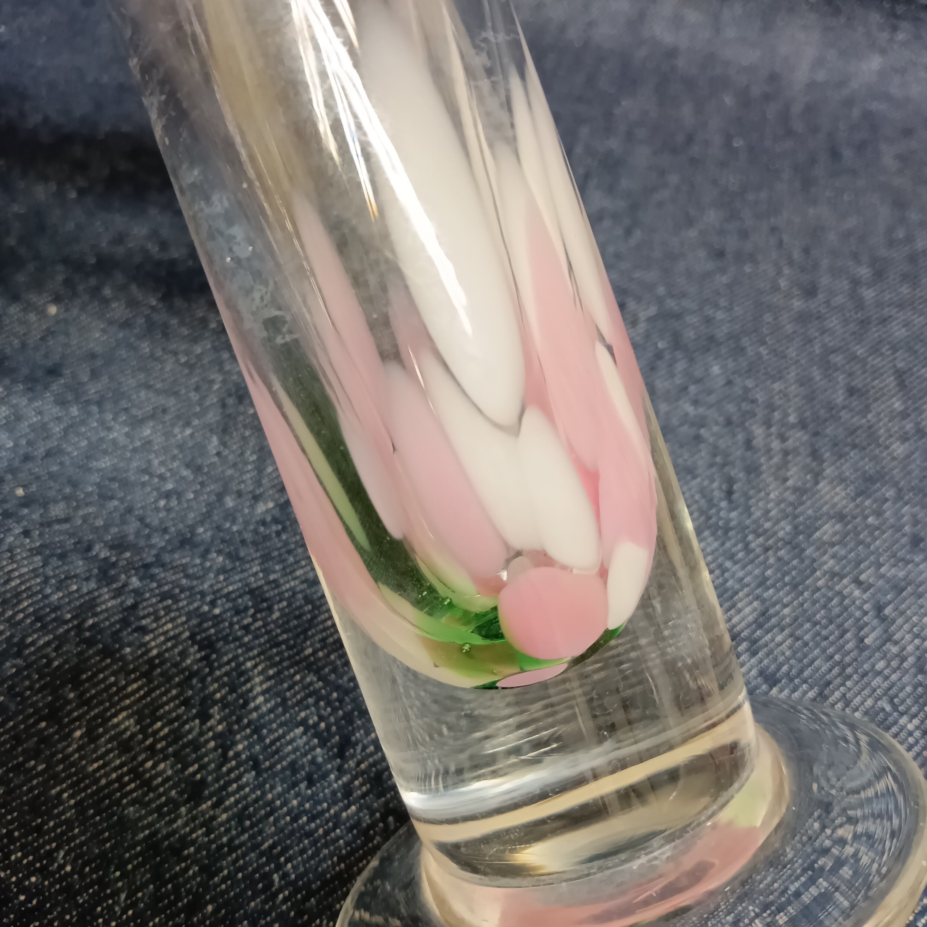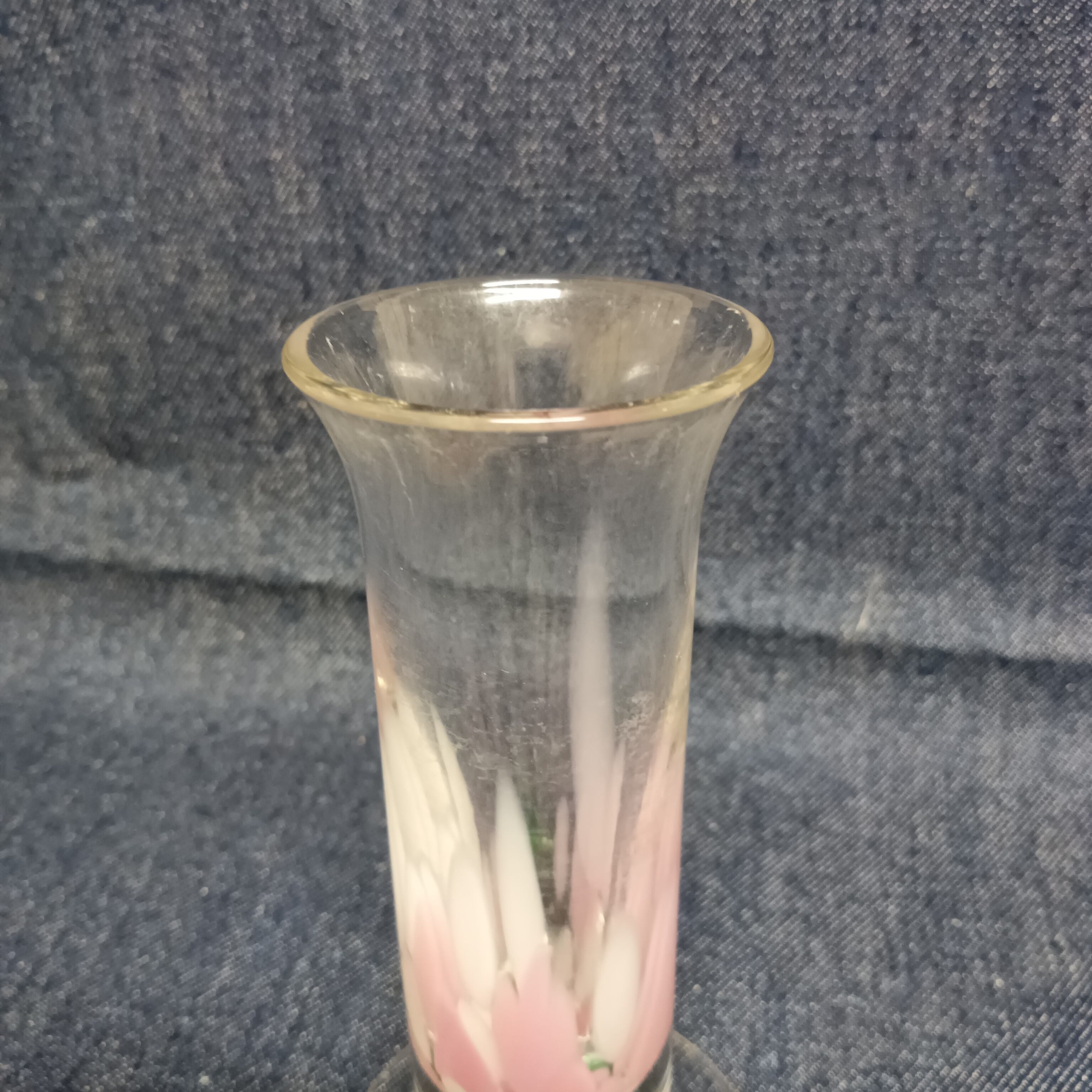 透明なガラスの中に、ピンクとホワイトの花びらのような模様が閉じ込められており、小さな花が咲いているような可愛らしいデザインです。底にはグリーンもあしらわれており、優しい色合いで空間を明るく彩ってくれます。