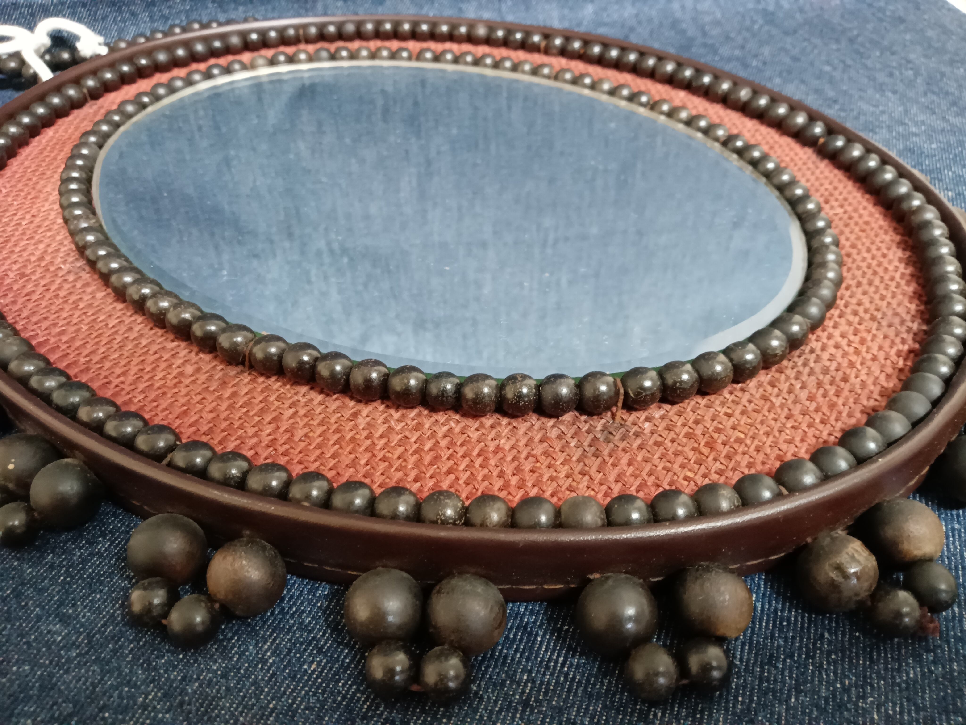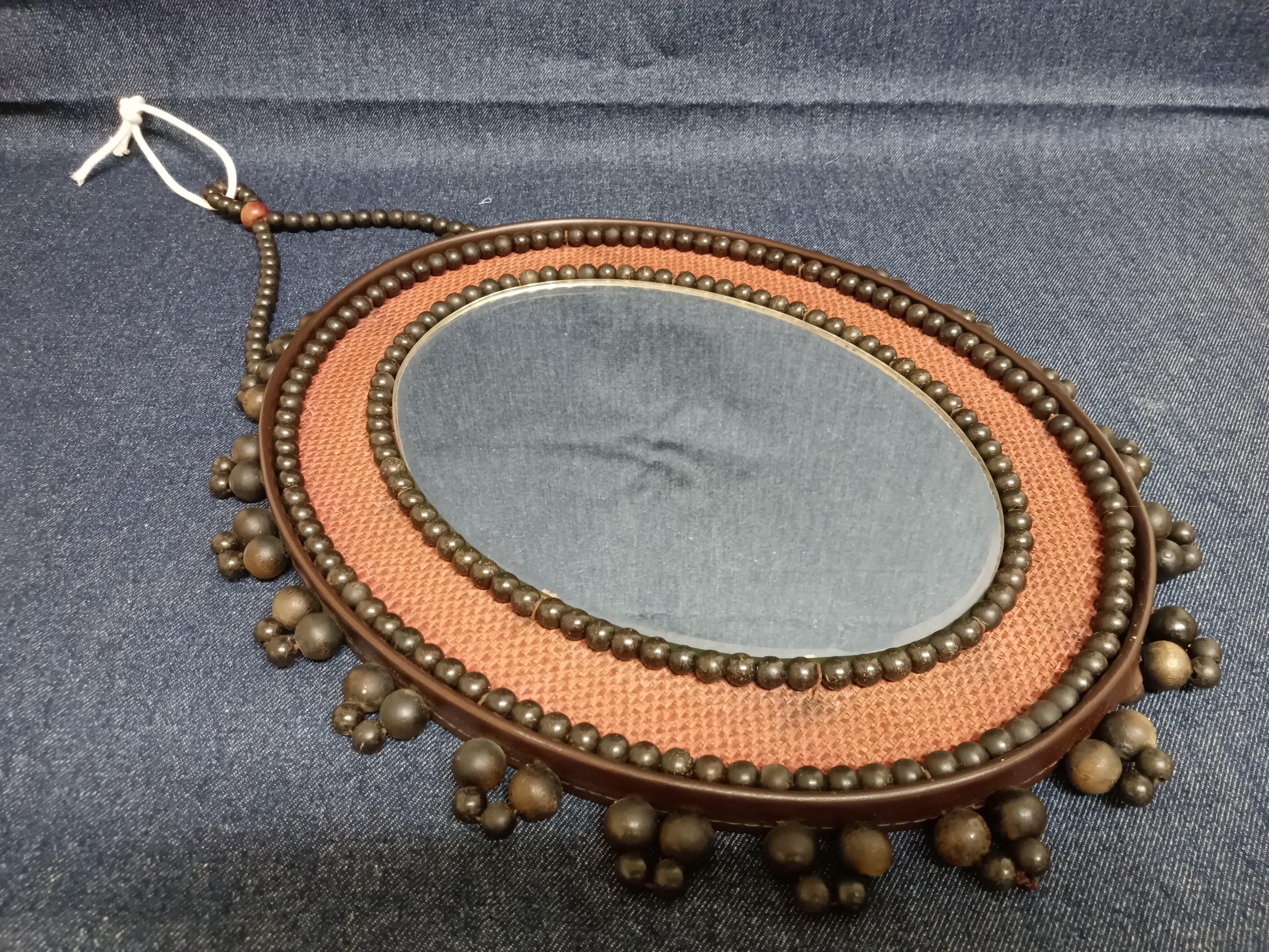 手作りの温もりを感じる、昭和レトロなビーズフレームの壁掛けミラーです。