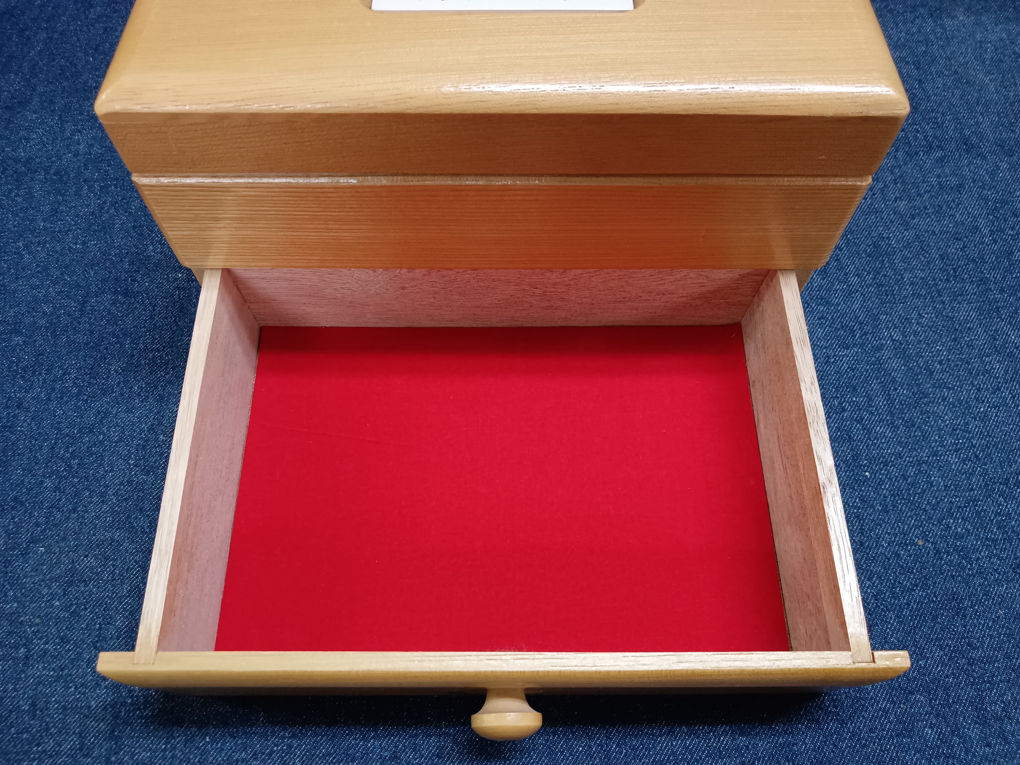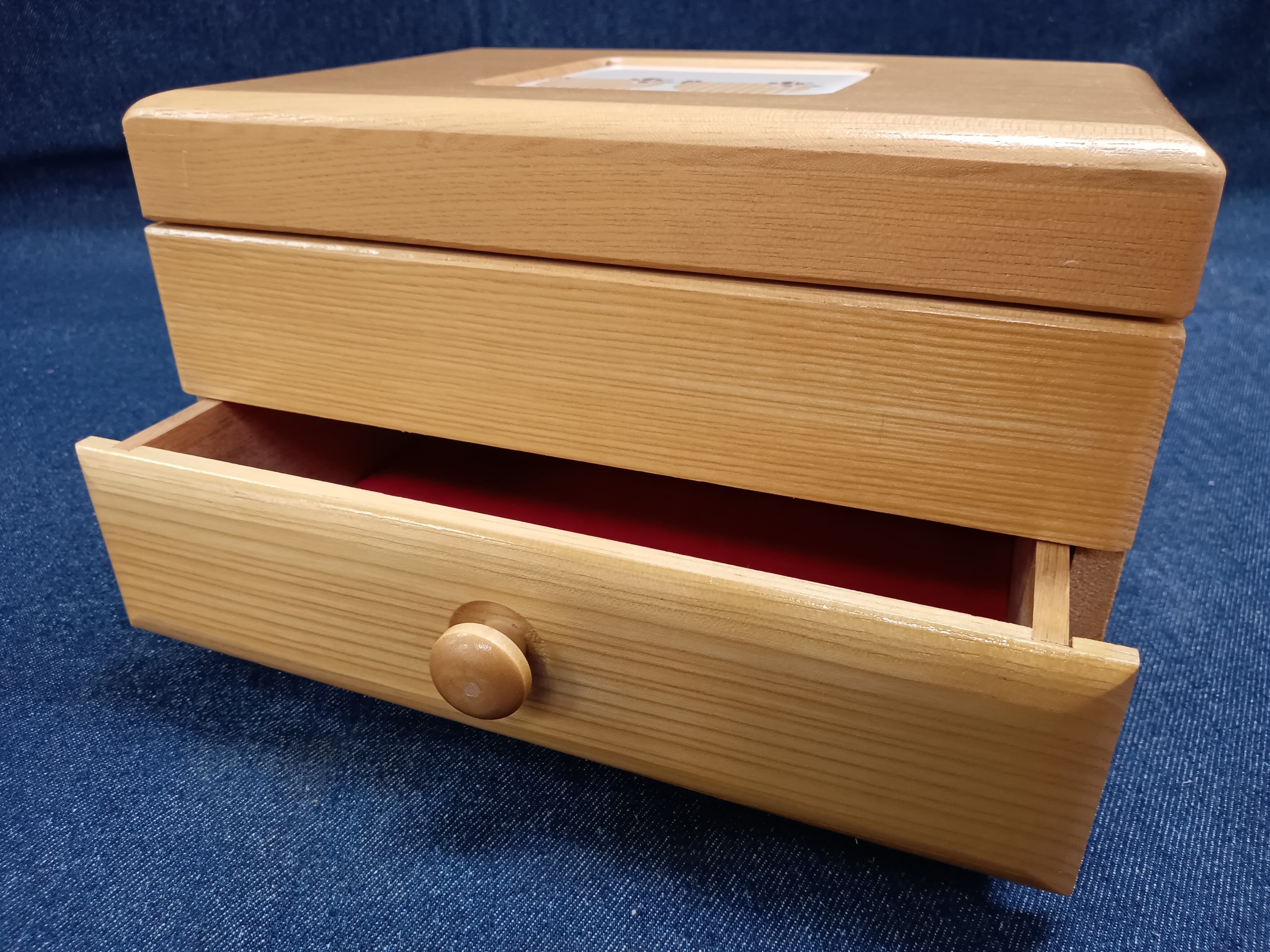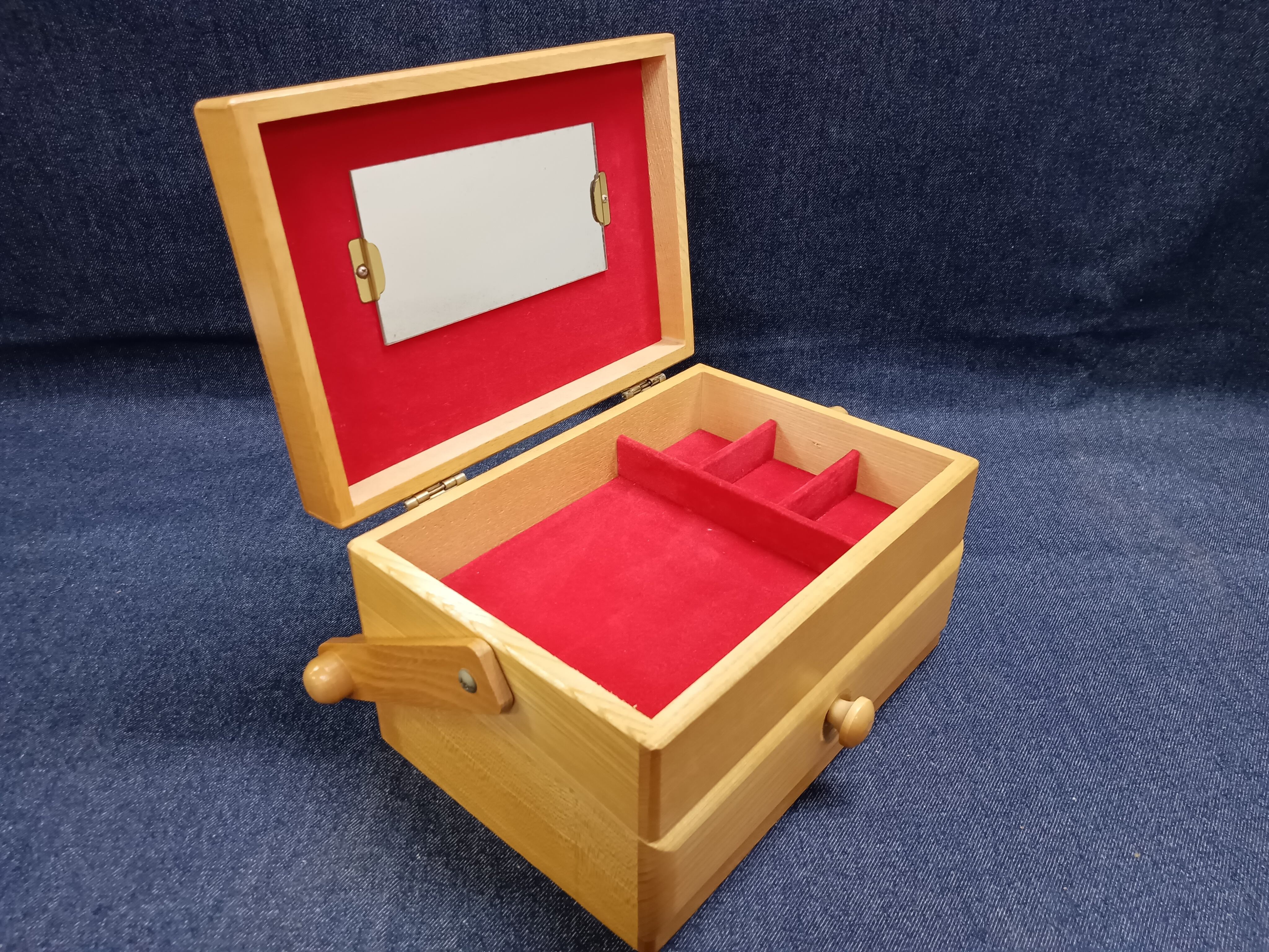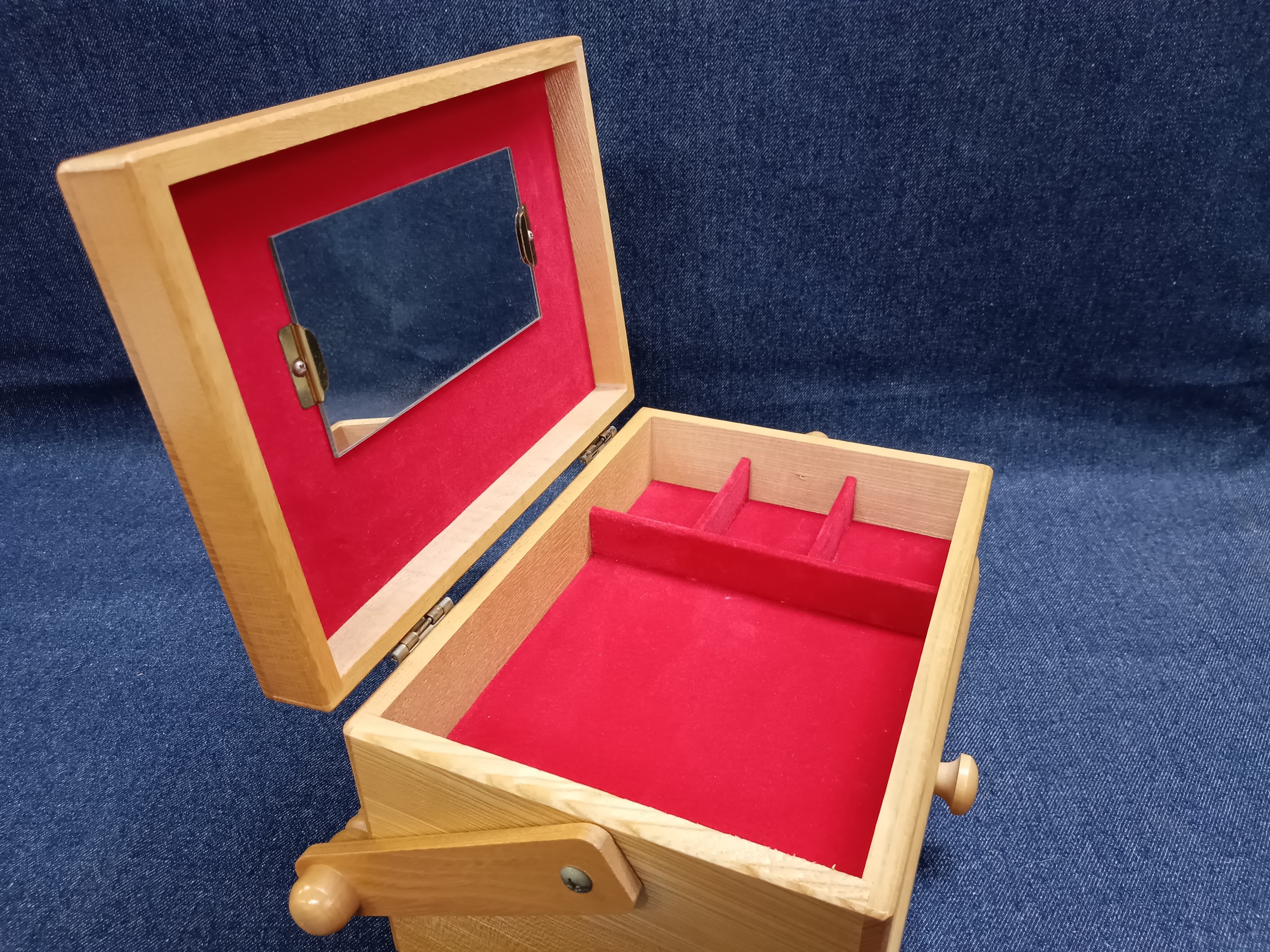 内側は鮮やかな赤いベルベット調の布張りで仕上げられ、上段には仕切りと小さなミラー付き。