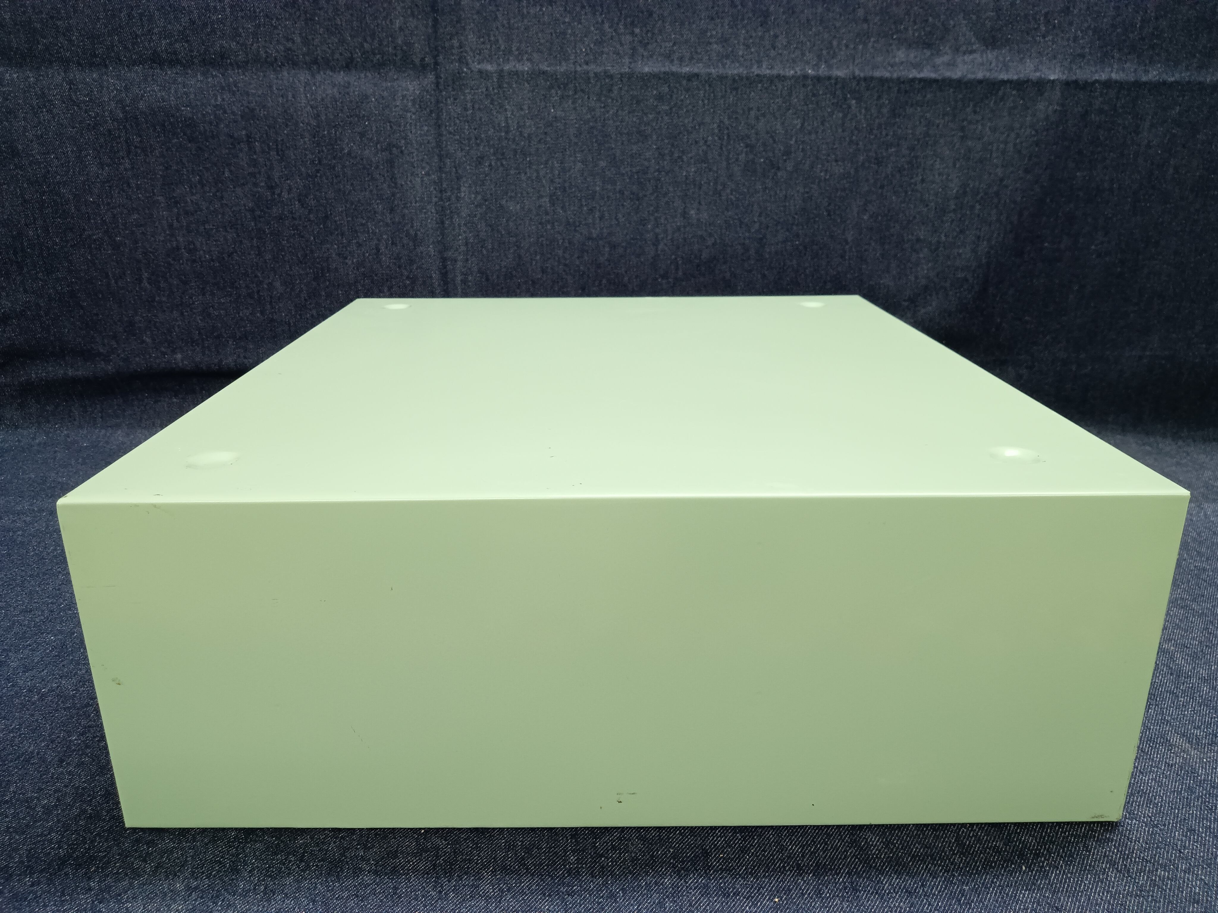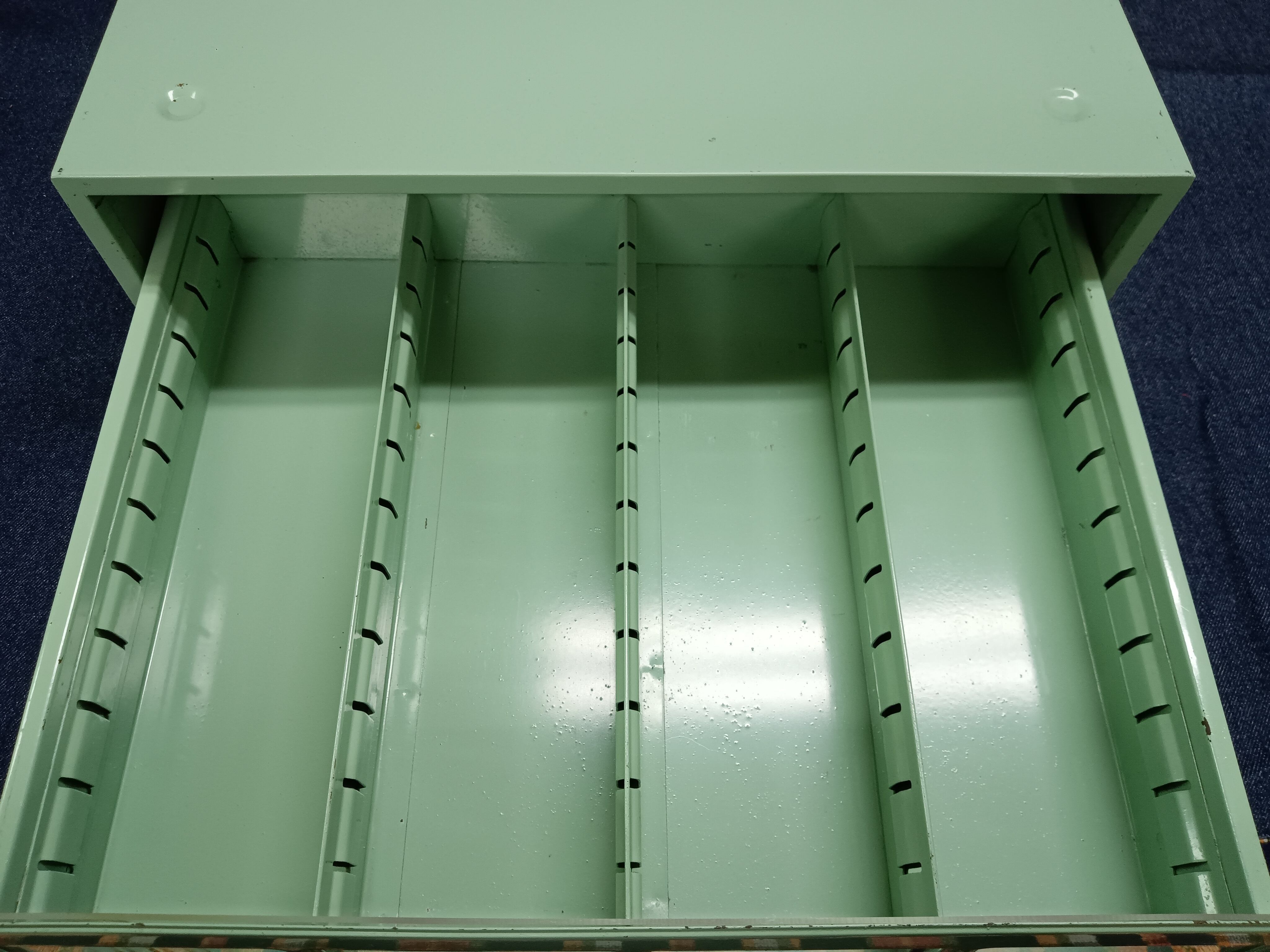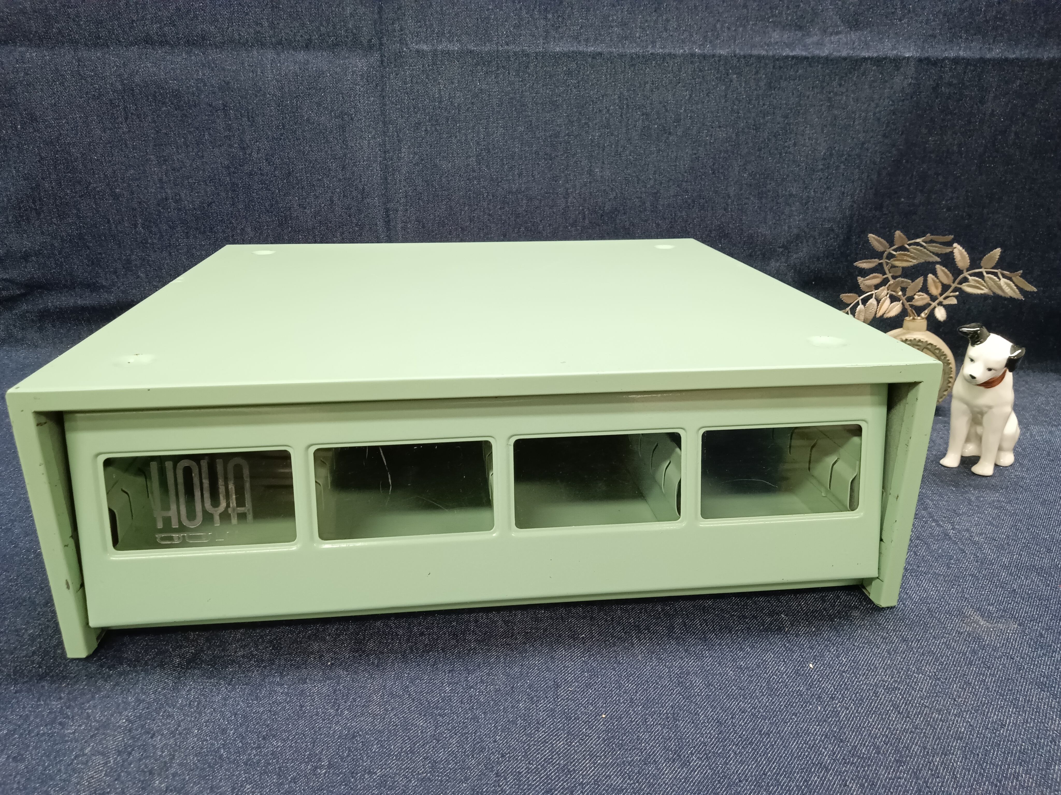淡いグリーンカラーが印象的な、HOYA LENS(ホヤレンズ)製のスチール引き出し収納ケースです。