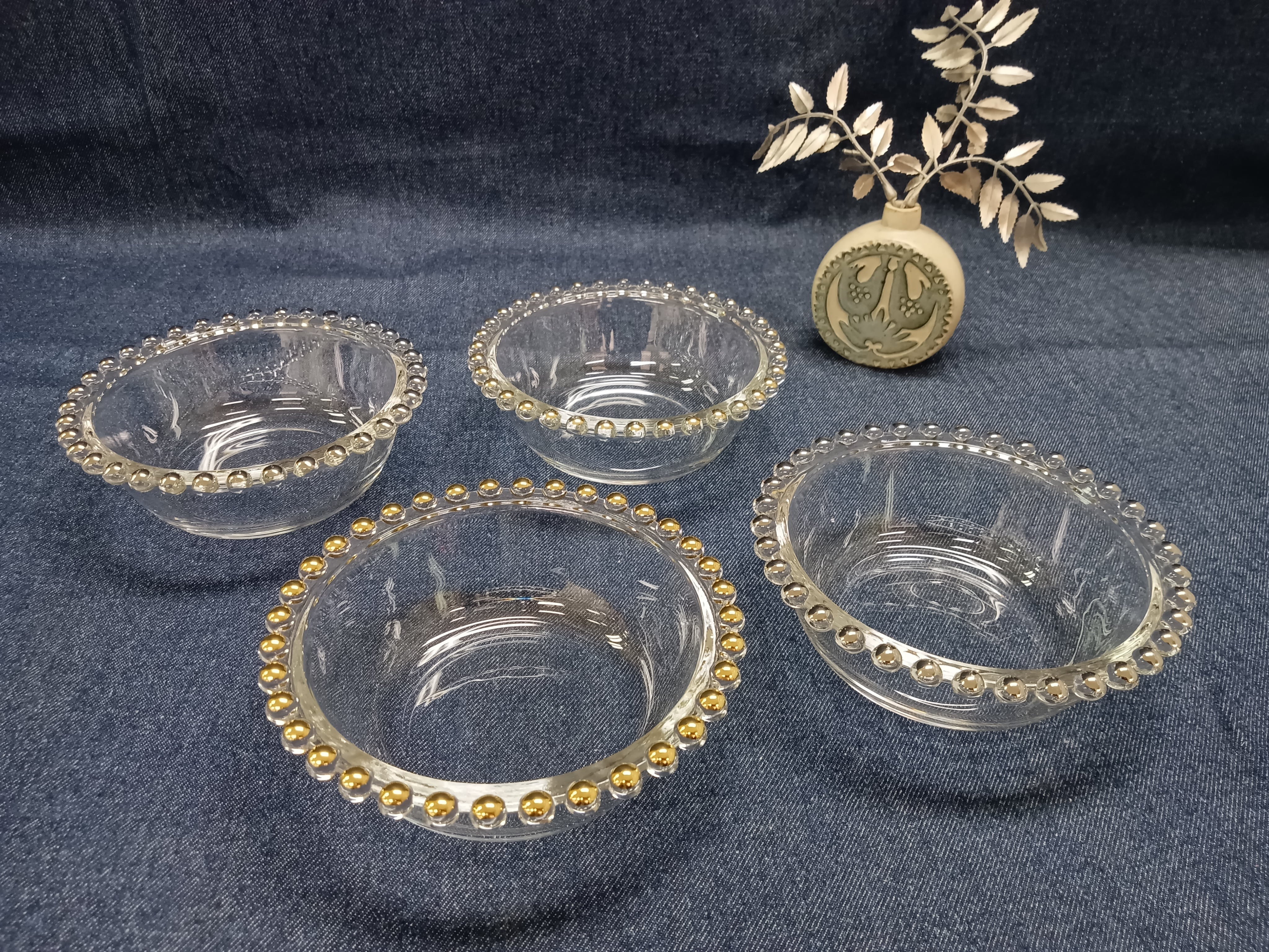 縁に施されたガラス玉装飾が美しい、昭和レトロなガラスボウル4点セットです。